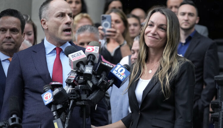 Karen Read, right, smiles as defense attorney David Yannetti, front left, speaks to reporters in front of Norfolk Superior Court after the judge declared a mistrial after jurors were unable to reach a verdict following a two-month trial, Monday, July 1, 2024, in Dedham, Mass. (AP Photo/Steven Senne)