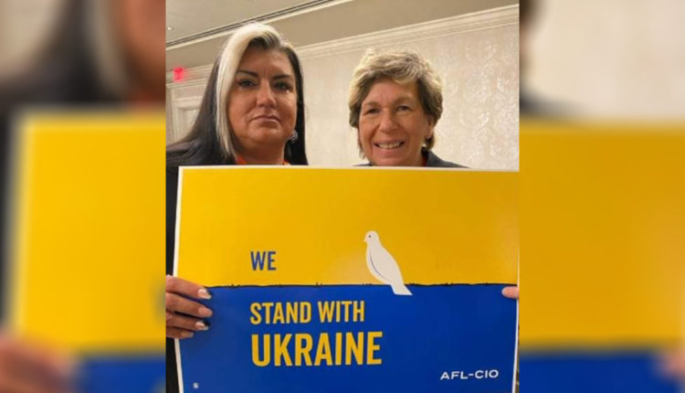 The Ukrainian flag, blue and gold. Hung vertically, so as to avoid the embarrassment of displaying it upside down, the way hack teachers’ union boss Randi Weingarten did in a tweet the other day, right before she sent out a follow-up tweet expressing her 100% Sapphic solidarity with “Ukriane.”
