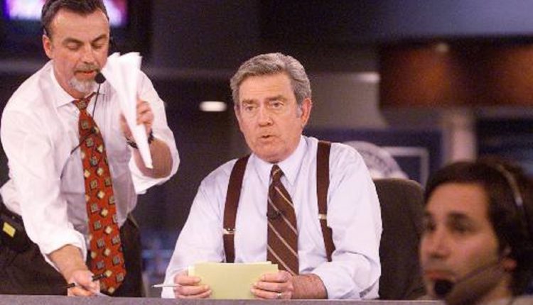 CBS News anchor Dan Rather reads from cue cards during a dress rehearsal of CBS News' election night 2000 coverage Friday, Nov. 3, 2000, in New York. Rather, who has covered every presidential election since 1964, will anchor the broadcast Nov. 7. John Reade, left, is a producer for Rather and Scott Berger, right, is the stage manager. (AP Photo/Mark Lennihan)