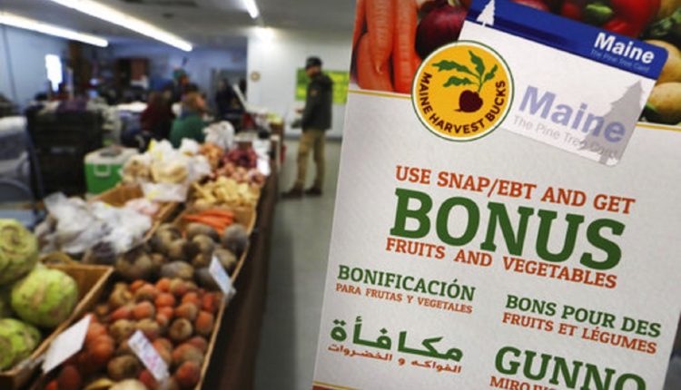 FILE - In this Friday, March 17, 2017, file photo, a sign advertises a program that allows food stamp recipients to use their EBT cards to shop at a farmer's market in Topsham, Maine. A proposal to curtail the nation’s food stamp program would pinch families struggling to pay for groceries and ripple through other areas of the economy, including supermarkets and discounters. (AP Photo/Robert F. Bukaty, File)