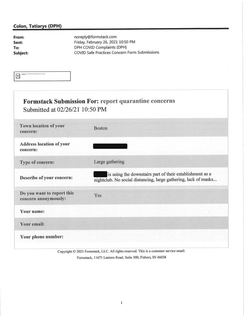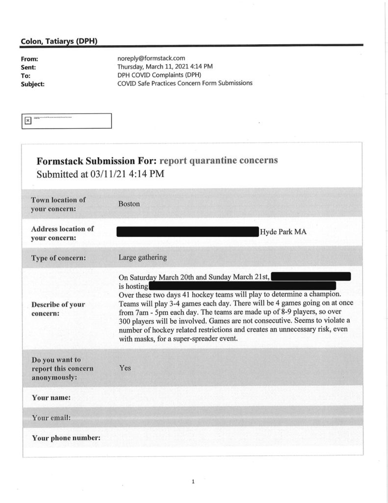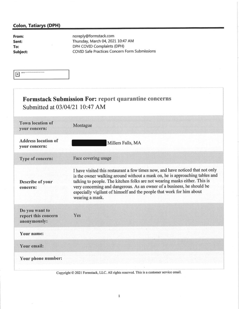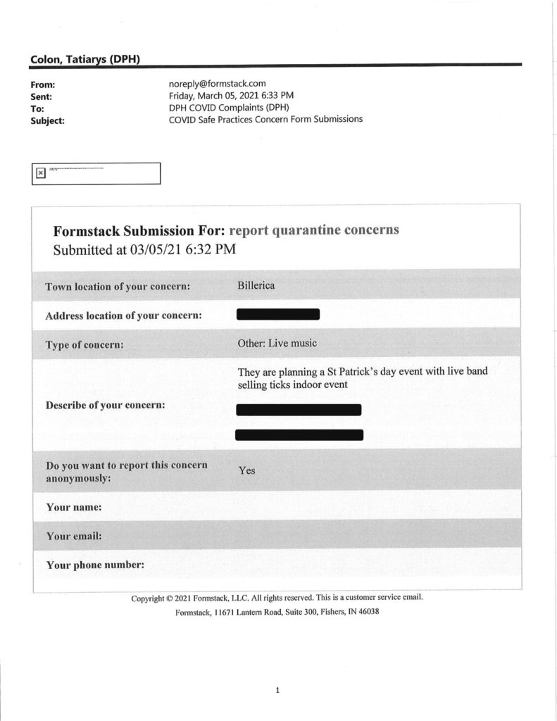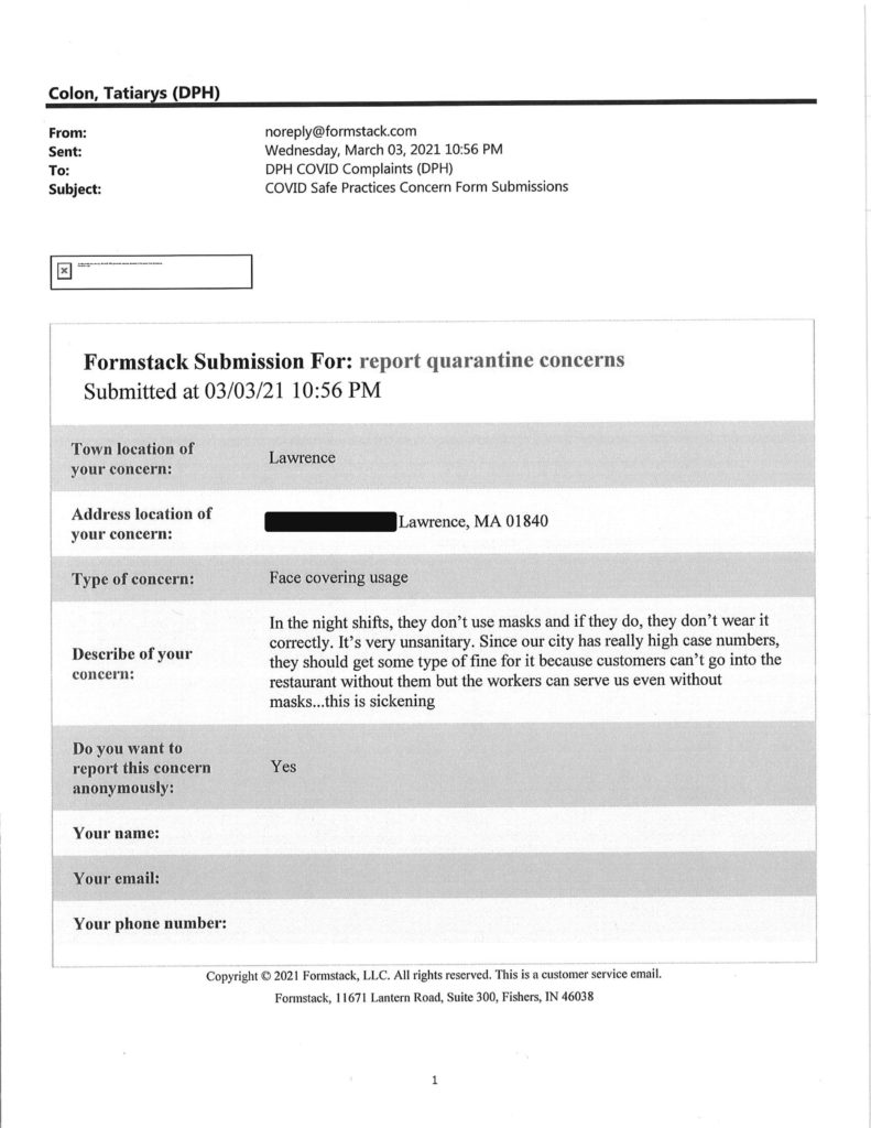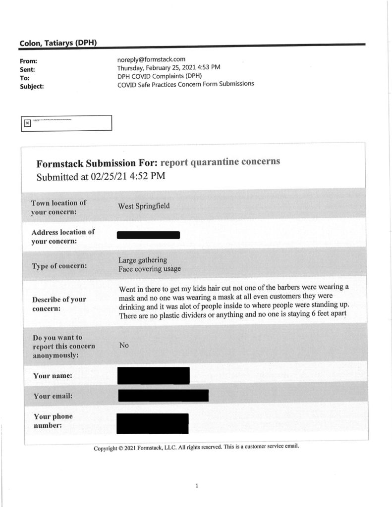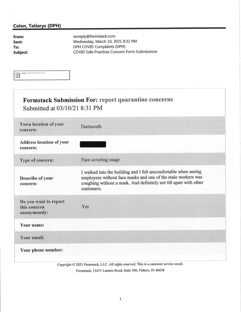 Howie has obtained another batch of reports filed through Gov. Charlie Baker’s Covid Complaints submission form at the Department of Public Health website.