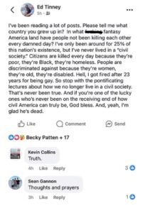 The post also criticized what Tinney described as systemic discrimination in America, citing poverty, race, gender, and sexuality. “Citizens are killed every day because they’re poor, they’re Black, they’re homeless,” Tinney wrote, before noting he had been fired in a past job “for being gay.”