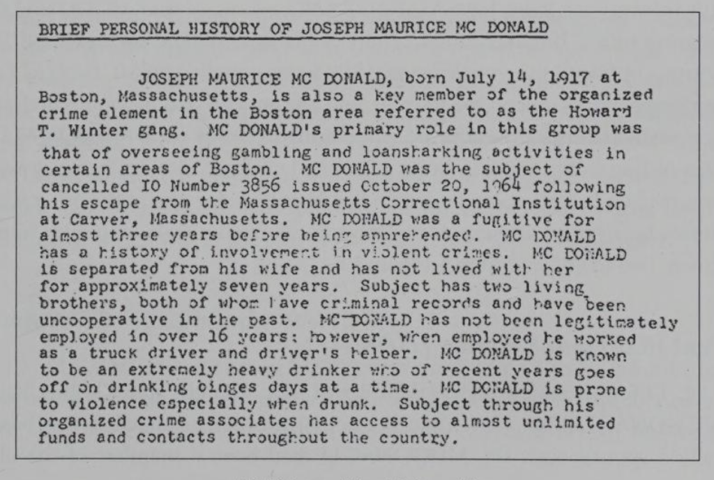 Here’s a collection of rare shots, FBI charts, and old documents from the days of Joe Mac, Jimmy Sims, and the Winter Hill Gang — along with the book Don’t Talk About Joe Mac by Springs Toledo.