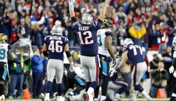 New England Patriots quarterback Tom Brady (12) celebrates a catch by wide receiver Phillip Dorsett during the second half of the AFC championship NFL football game against the Jacksonville Jaguars, Sunday, Jan. 21, 2018, in Foxborough, Mass. (AP Photo/Winslow Townson)