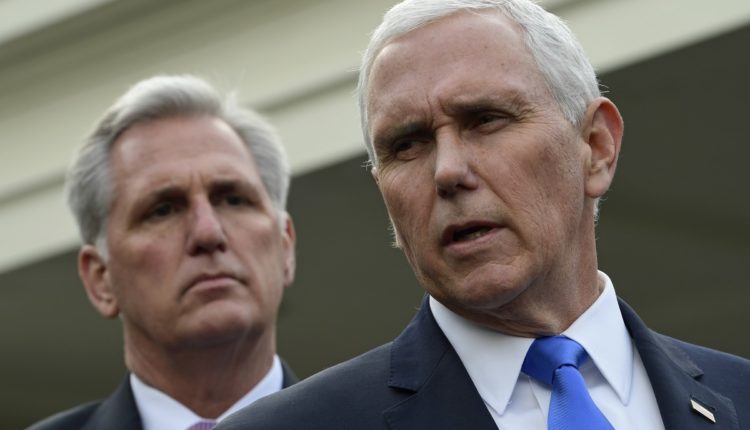 Vice President Mike Pence, right, standing with House Minority Leader Kevin McCarthy of Calif., left, speaks to reporters following a meeting with President Donald Trump and Democratic congressional leaders at the White House in Washington, Wednesday, Jan. 9, 2019. (AP Photo/Susan Walsh)