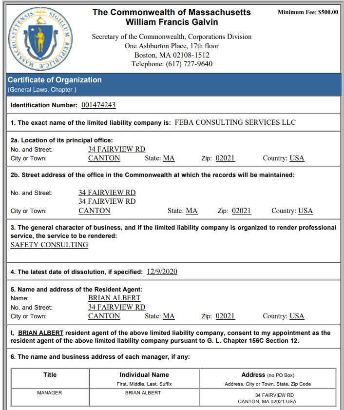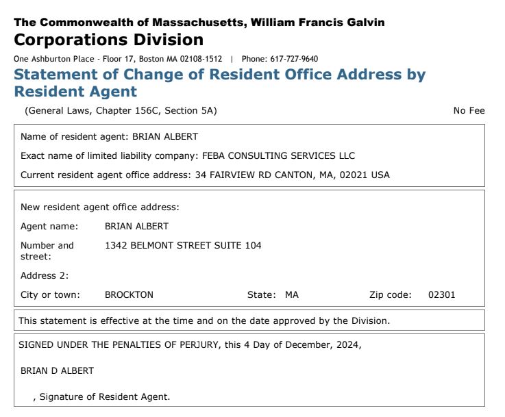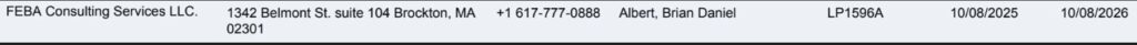 Note FEBA Consulting Services LLC’s address: 1342 Belmont Street Brockton.