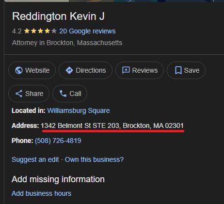 By an amazing coincidence, Albert’s office happens to be at the exact same location as the office of Jen McCabe’s first attorney in the Karen Read scandal, the ancient Kevin Reddington.