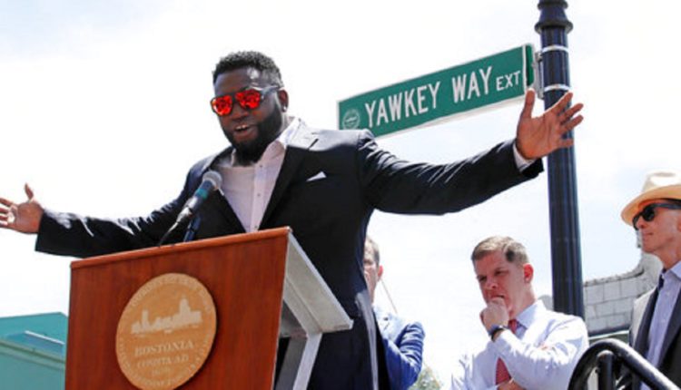 FILE - In this June 22, 2017, file photo, retired Boston Red Sox designated hitter David Ortiz is honored with the renaming of a portion of Yawkey Way to David Ortiz Drive outside Fenway Park in Boston. The City of Boston approved a plan Thursday, April 26, 2018, to change the name of Yawkey Way to Jersey Street, it's original name. The street had been named in honor of former Red Sox owner Tom Yawkey, who some have said was racist. At center rear is Boston Mayor Marty Walsh, and at right is Red Sox principal owner John Henry. (AP Photo/Charles Krupa, File)